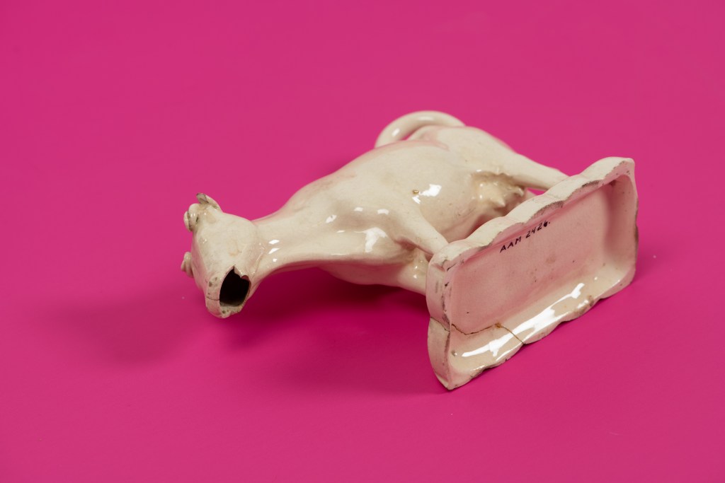 Denne fløtemuggen (AAM.02426) kom til KUBEN for 111 år siden, mot slutten av 1913. Den har nok hatt en lang og hard reise fra Staffordshire, og har nok også vært elsket gjennom tiden den ble brukt. Muggen har vært limt i bunnen, mistet underkjeven, og mangler et øre. Den har mistet et lokk som hører hjemme på ryggen, og ser ut til å kanskje ha vært limt på plinten mer enn én gang.